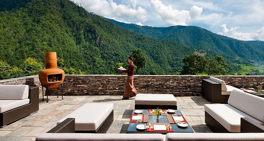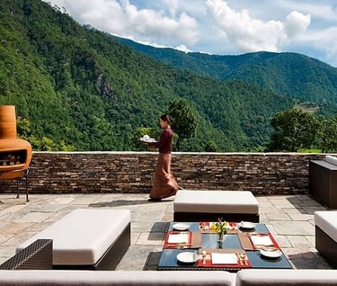 The staff here are extremely well-groomed and keen to provide excellent service. Facilities include a spa with an outdoor hot-stone bath, a bar, and a shop with upmarket crafts. Your meals are fresh, tasty, and beautifully presented. Choose from Western, Indian, and Bhutanese feasts. Dine on a sunny veranda, in the dining room, or at a surprise romantic spot in the forest. Some house wines are included with your room.