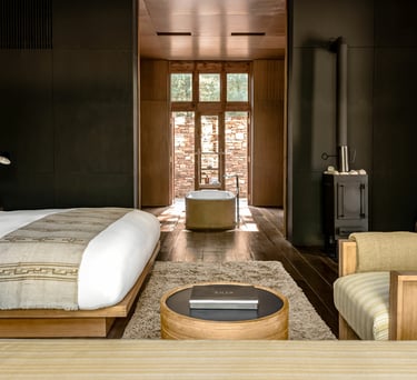 Built in the style of a modern fortress, the lodge has clay-colored, earth-packed walls. The clean-lined living spaces feature blazing fires and window-side banquettes.
